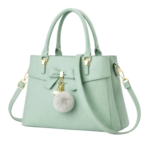 The bag features strong dual handles for comfortable hand carrying and an adjustable shoulder strap for shoulder or crossbody use. A decorative bow with a soft pom-pom charm adds a trendy and fashionable touch. The spacious interior with multiple compartments helps keep your daily essentials well organized.